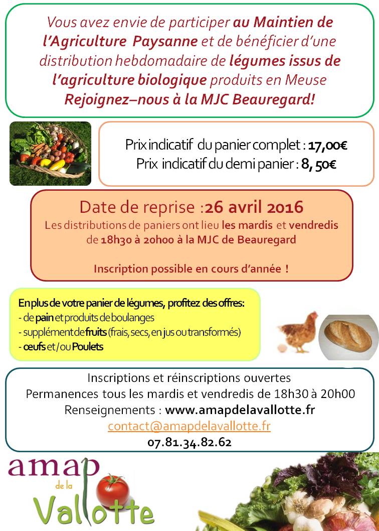 Que vous soyez déjà amapiens ou nouvellement intéressés, sachez que les distributions reprendront mardi 26 et vendredi 29 avril 2016, à la MJC Beauregard de 18h30 à 20h00.